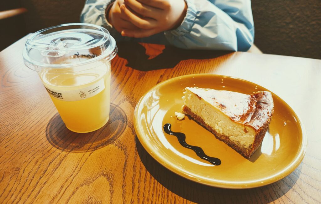 血液検査を頑張った日のご褒美に選んだのは、チーズケーキとアップルジュース。