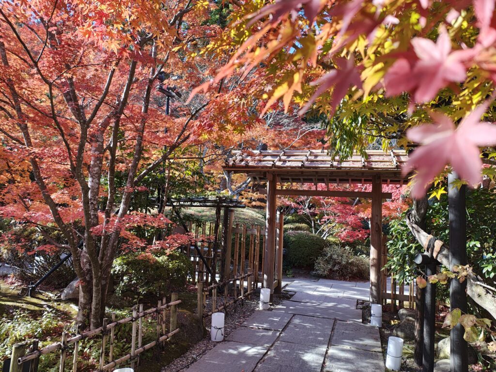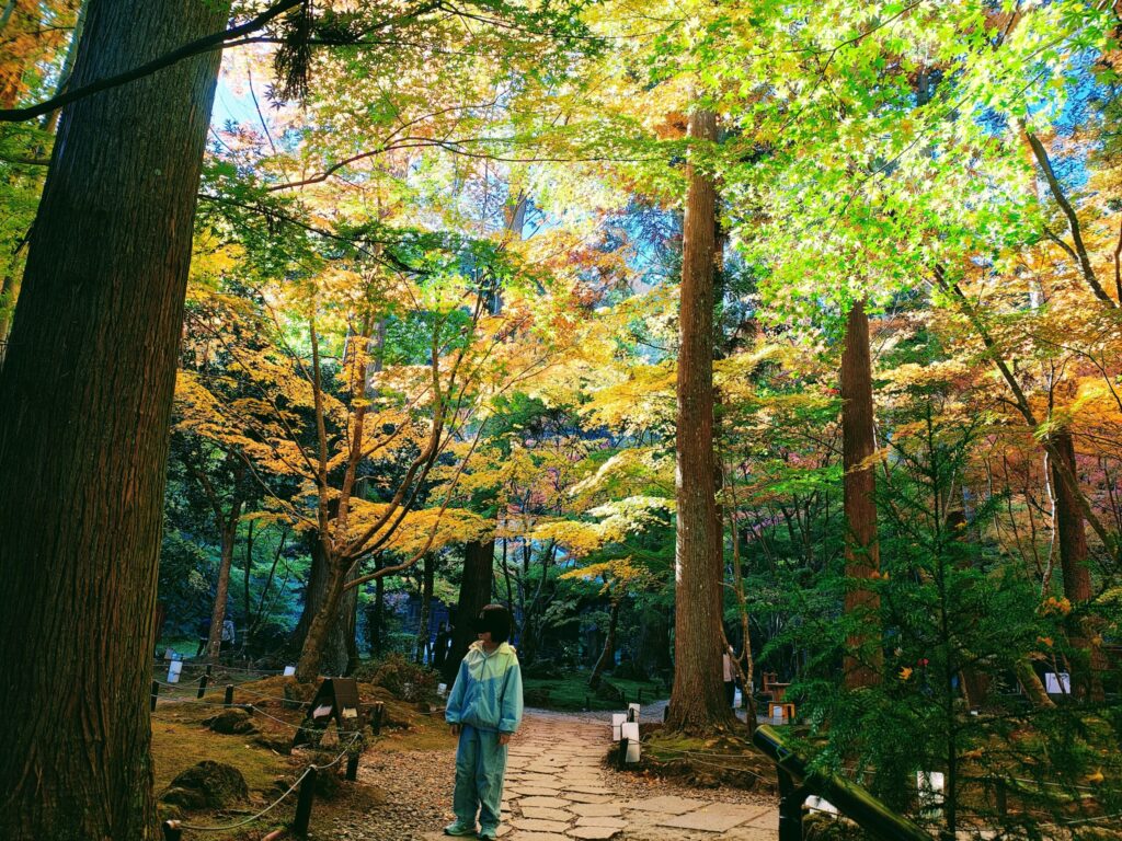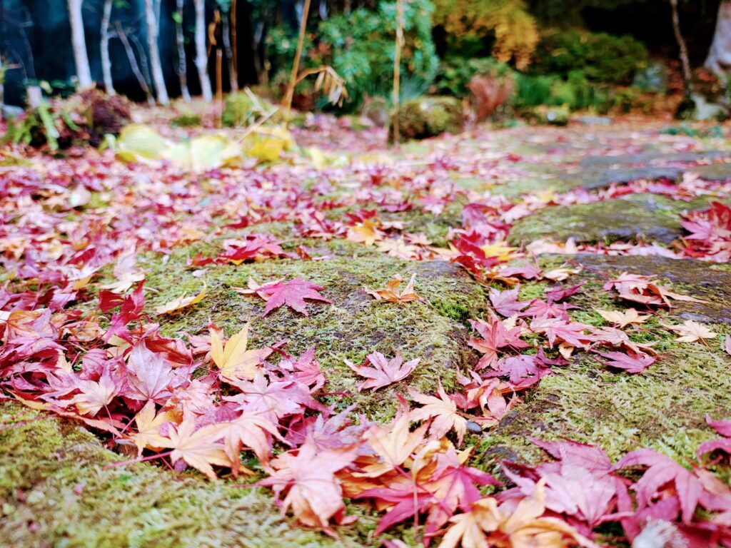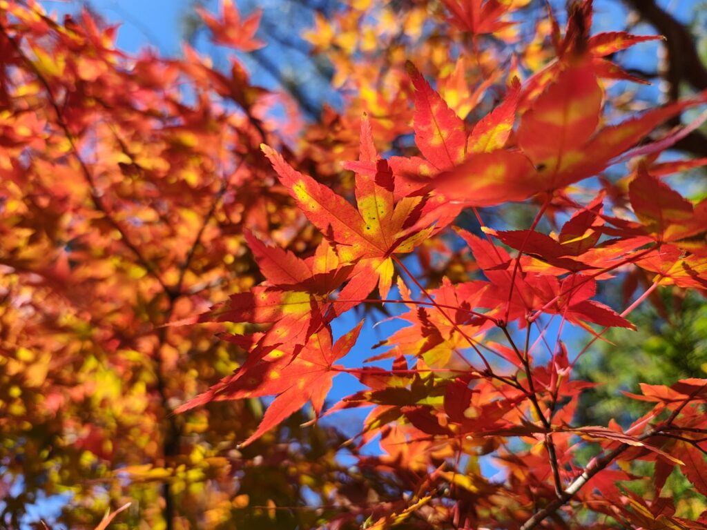 晴れた日は、紅葉した葉を通した木漏れ日がふわっと差し込んで、赤・黄・橙・緑・少し紫がかった色まで混ざった、自然が作る“色のグラデーション”に包まれます。