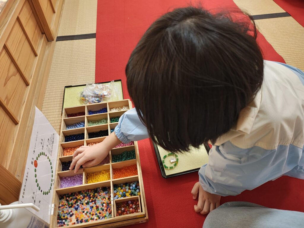 娘は真剣に色を選んで並べて、満足のいく数珠ができたようでニコニコ。