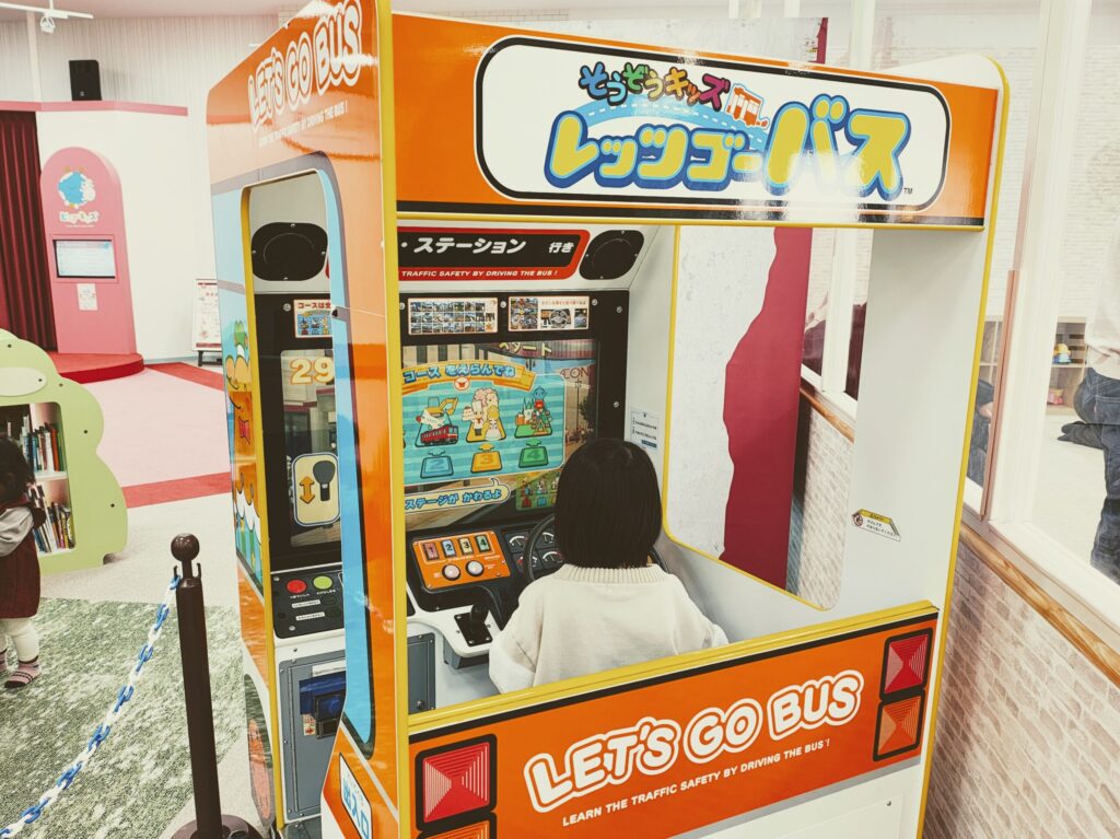 画面に合わせてハンドルを切って遊ぶバスの遊具。